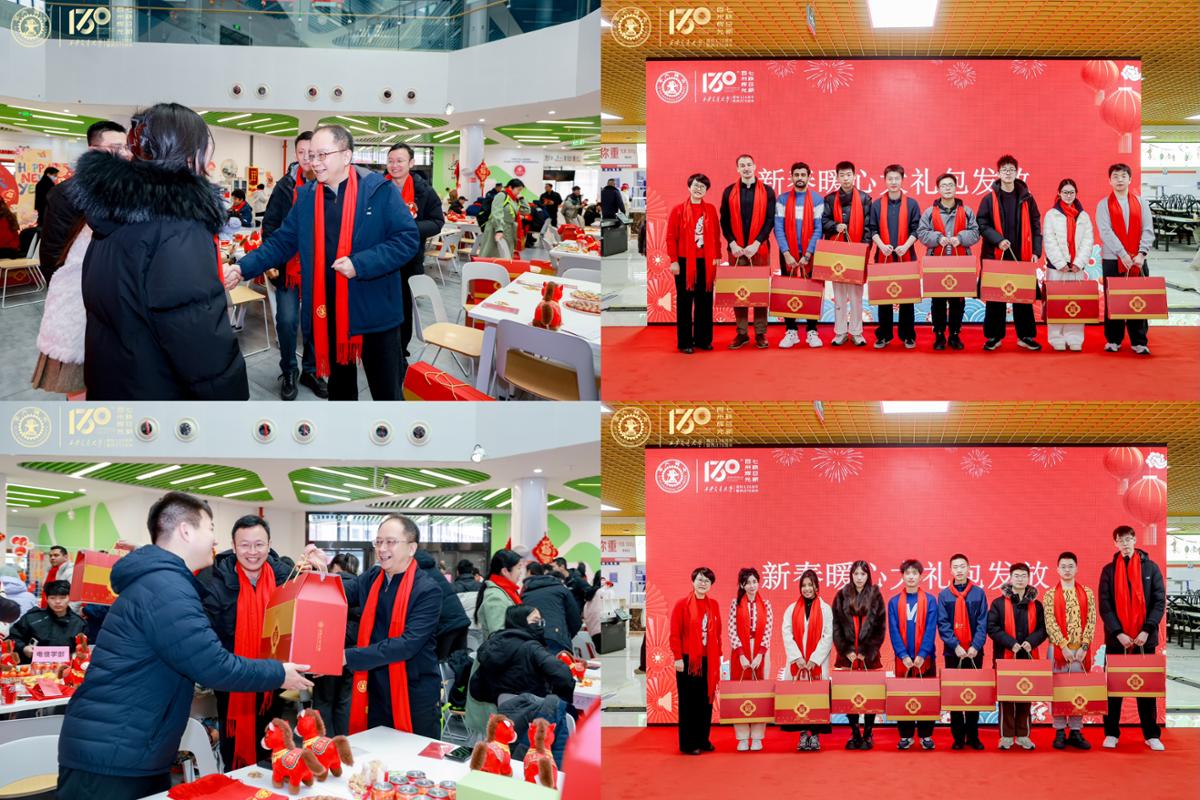 在这个团圆的日子里,学校还为同学们精心准备了满载心意的“新春暖心大礼包”。柴渭、王欢等与会领导和老师们为大家送上印有交大标识的红围巾、吉祥马玩偶、寓意美好的立体红包以及春节加餐券,并询问留校期间学生们的学习和生活情况,让同学们真切感受到“家”的温暖。