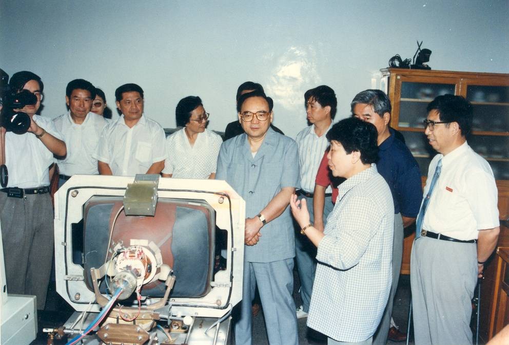 时任中央政治局委员、书记处书记、中宣部部长丁关根校友参观学校电子物理与器件研究所(1992年)