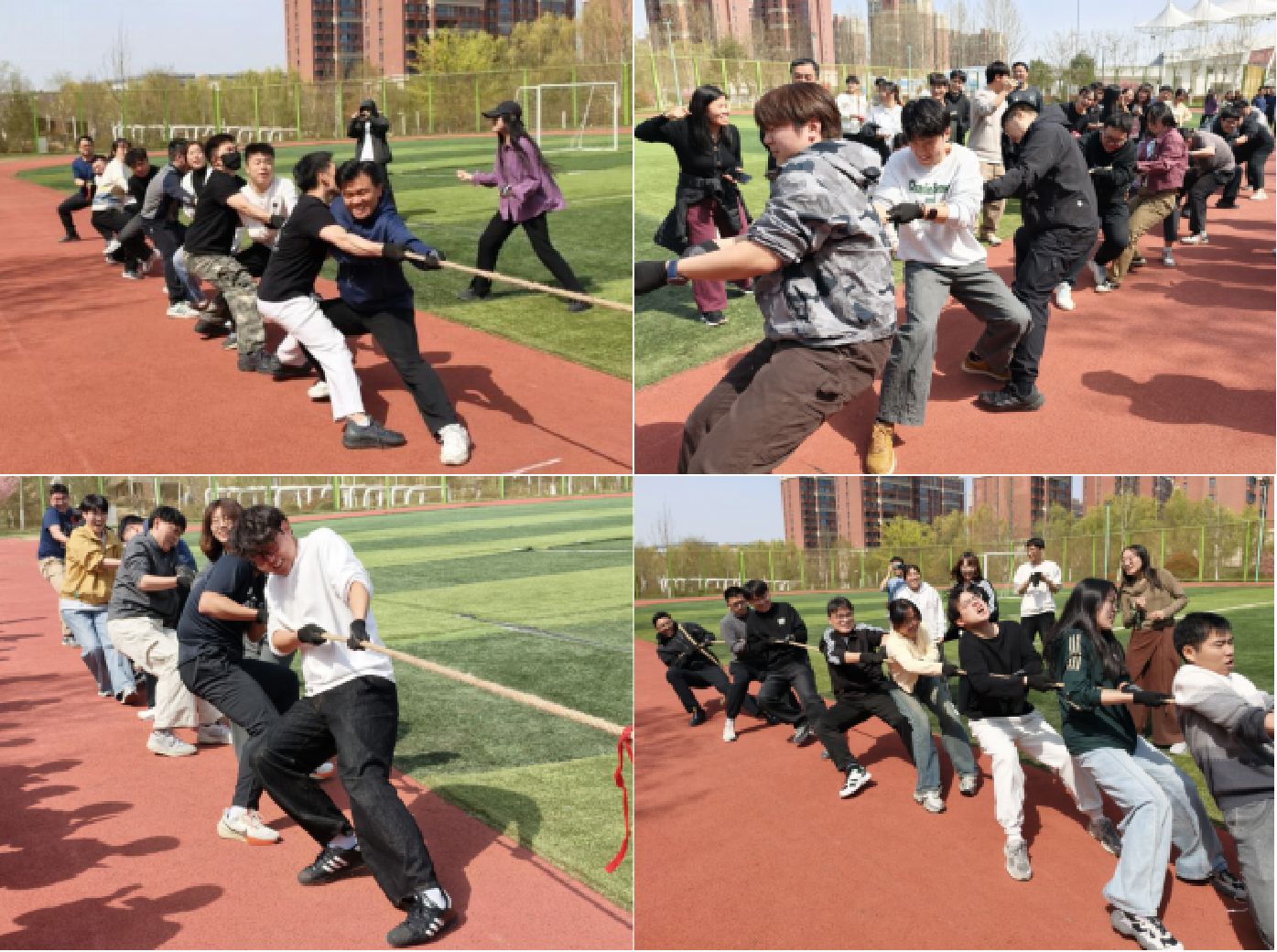 首轮八进四的对决正式开始。八支队伍轮番上阵,各队伍凭借默契的配合与顽强的毅力展开比拼。赛场上,队员们紧握手中长绳,保持重心下压,一场力量与技巧的对决一触即发。随着裁判一声哨响,“一二、一二”的口号声响彻田径场。现场的呐喊助威声此起彼伏,尽显交大师生顽强拼搏的卓越风范。