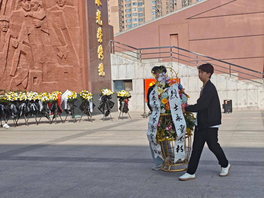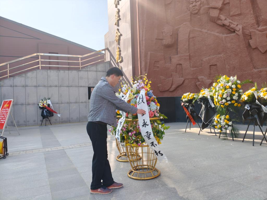 默哀毕,两名党员代表缓步上前,向烈士浮雕敬献花篮。崇实书院党总支秘书薛成在花篮前驻足凝视,仔细整理挽联,向革命先烈致以最崇高的敬意。