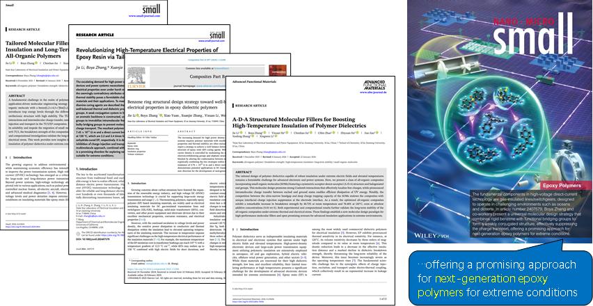 近期,上述研究成果分别以《受体-供体-受体结构分子填料用于提升聚合物介电材料高温绝缘性能》(A-D-A Structured Molecular Fillers for Boosting High-Temperature Insulation of Polymer Dielectrics)、《环氧树脂聚合物热性能与电性能均衡优化的苯环结构设计策略》(Benzene ring structural design strategy toward well-balanced thermal and electrical properties in epoxy dielectric polymers)、《弱共轭刚性结构设计提升环氧树脂高温绝缘性能》(Revolutionizing High-Temperature Electrical Properties of Epoxy Resin via Tailoring Weak Conjugation Rigid Structures)和《定制化分子填料赋予全有机聚合物优异的高温绝缘性能与长期稳定性》(Tailored Molecular Fillers Enable High-Temperature Insulation and Long-Term Operating Stability in All-Organic Polymers)为题陆续在在国际知名期刊Advanced Functional Materials、Composites part B: Engineering和Small发表,其中1篇成果被选为Small期刊Frontispiece高亮推荐。