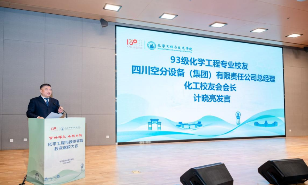 第一届化工校友会会长、1993级化学工程专业校友、四川空分设备(集团)有限公司总经理计晓亮代表化工校友会发言。他感谢母校的信任与嘱托,分享了四川空分集团近六十年来的发展以及对化工行业发展的思考。他表示,作为化工校友会第一届会长,将带领校友会做好母校与校友之间的“连心桥”、校友与校友之间的“互助纽带”。