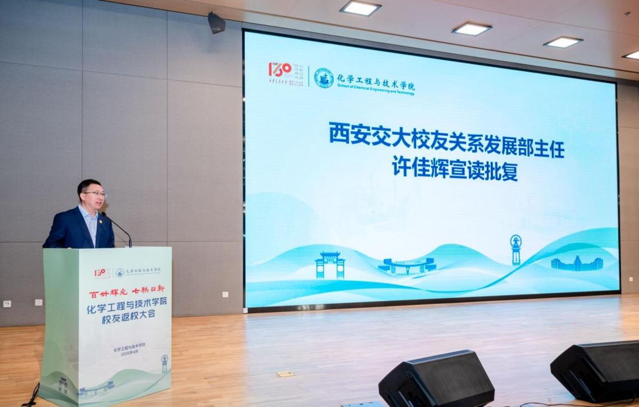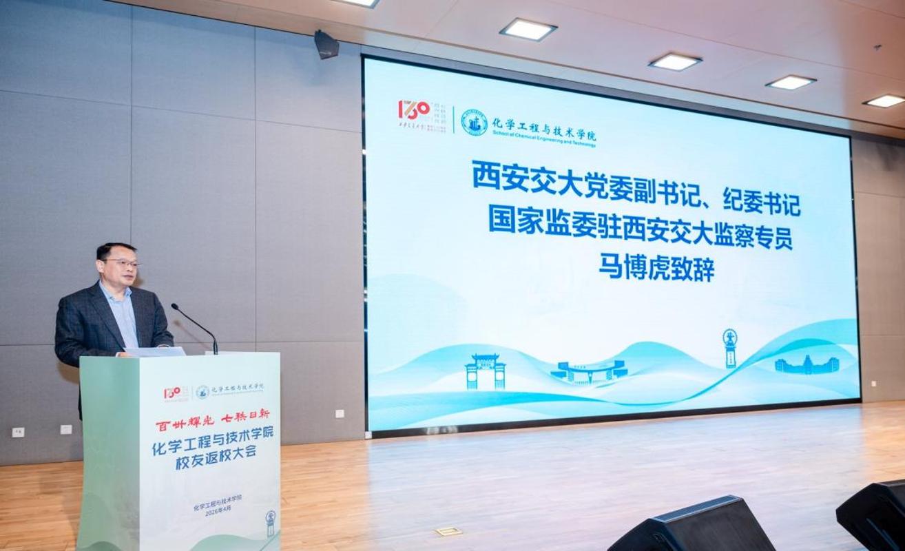 在西安交通大学建校130周年暨西迁70周年之际,4月7日上午,化学工程与技术学院在中国西部科技创新港举行校友返校大会。西安交通大学党委副书记、纪委书记、国家监委驻西安交通大学监察专员马博虎,中国石化联合会原会长李寿生,中国科学院工程物理研究所所长陈海生,全国各地的校友代表,合作企业代表,学校相关职能部门领导,以及化工学院师生代表共聚一堂,共同追忆在校的美好时光,共同庆祝母校建校130周年。