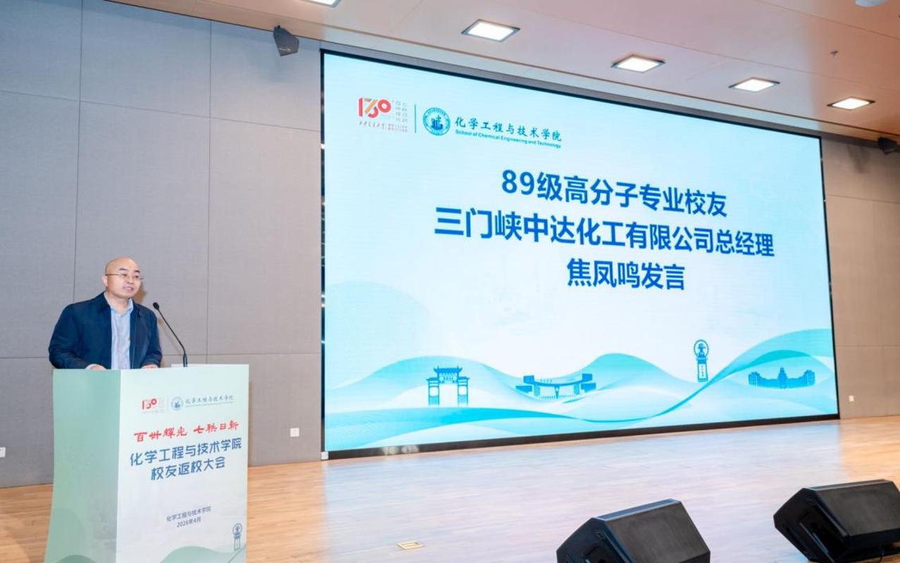 1989级高分子专业校友、三门峡中达化工有限公司总经理焦凤鸣作为返校校友代表发言。通过分享其在人生各个阶段创作的诗词,他满怀深情地回忆了在交大的求学经历和个人成长历程,感谢母校对于他在人生各个阶段的深刻影响。焦凤鸣表示,交大给予了他值得永远传承和铭记的品质和精神,是他不断前行奋斗的动力源泉,他代表广大化工校友衷心祝愿母校和学院发展越来越好。