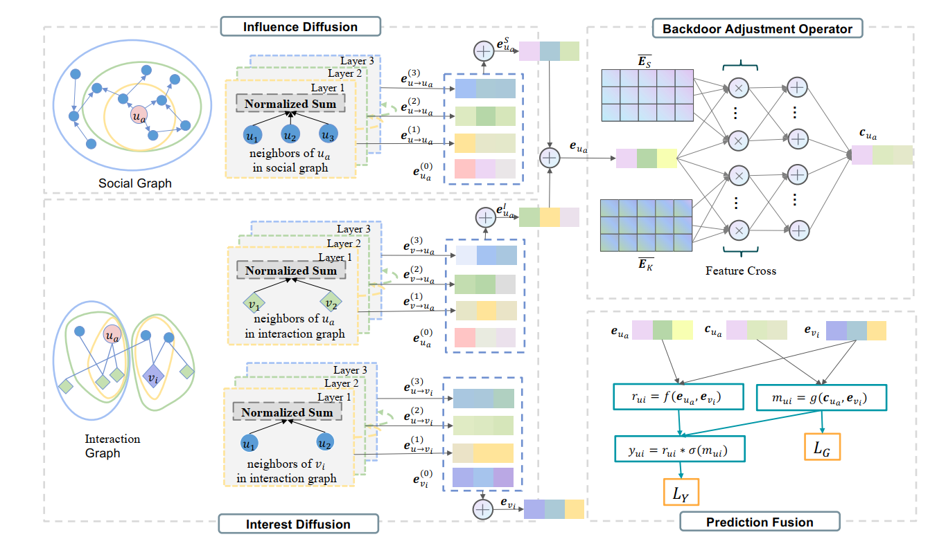 通过大量实验对比与消融分析,研究团队揭示了社交流行度偏差与物品流行度偏差的相互作用机制。首先,研究表明通过因果图建模可以系统消除两类偏差的干扰。在四个真实社交数据集上的实验结果表明,CISGNN模型在推荐准确率(HR、NDCG指标)和推荐多样性(新颖度、小众物品覆盖率)两项关键指标上均显著优于现有最优模型,打破了推荐系统中准确性与多样性难以兼顾的传统困境。其次,该研究探讨了后门调整与反事实推理两种去偏方法的协同作用。分析表明,后门调整主要用于消除混杂因素对用户表征学习的干扰,而反事实推理则进一步剥离一致性偏好对排序分数的直接影响,二者共同实现了对社交流行度偏差的根源性消除。