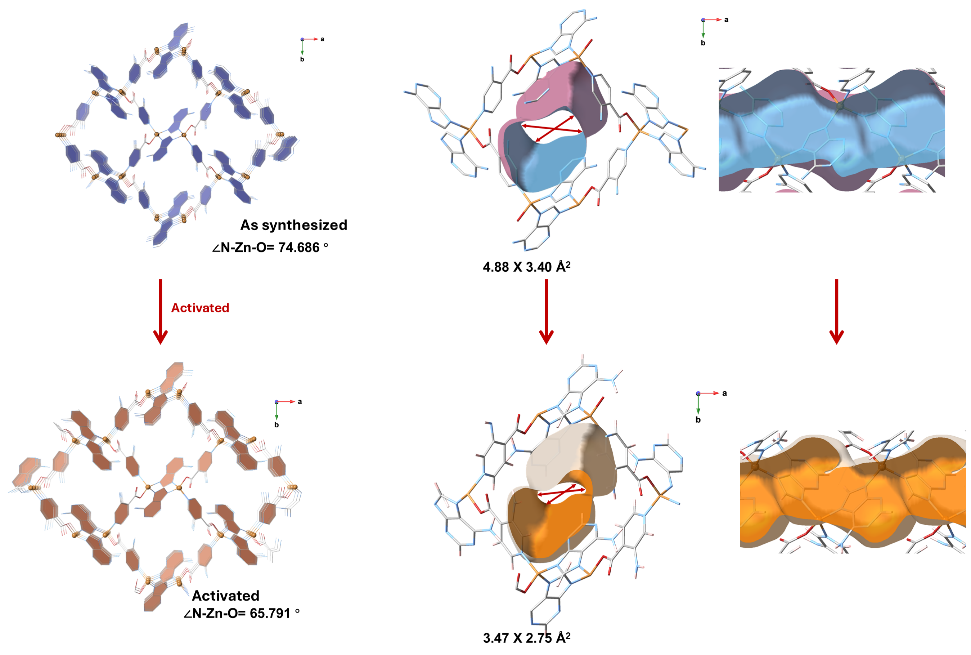 针对上述挑战,西安交通大学化工学院杨庆远教授团队与北京大学杨四海教授合作,提出了一种基于“分子门控”效应的乙烷选择性吸附新策略。研究团队设计合成了锌-腺嘌呤基金属-有机框架材料ZAI-3N,通过在孔道中引入氨基功能基团,构建了温度响应型的“分子门”结构。在313K、1bar条件下,ZAI-3N对C₂H₆/C₂H₄的吸附量比高达10.6,IAST选择性达到11.7。同步辐射X射线粉末衍射与理论模拟揭示:乙烷的甲基可触发氨基旋转,促使“分子门”开启(能垒约5kJ/mol);而乙烯的π电子则面临显著更高的扩散能垒(约11kJ/mol)。动态穿透实验证实,ZAI-3N可一步获得纯度超过99.4%的聚合级乙烯,且具有优异的循环稳定性。该“分子门控”策略还可拓展至丙烷/丙烯等其他具有工业挑战性的分离体系,为下一代吸附材料的设计提供了新思路。