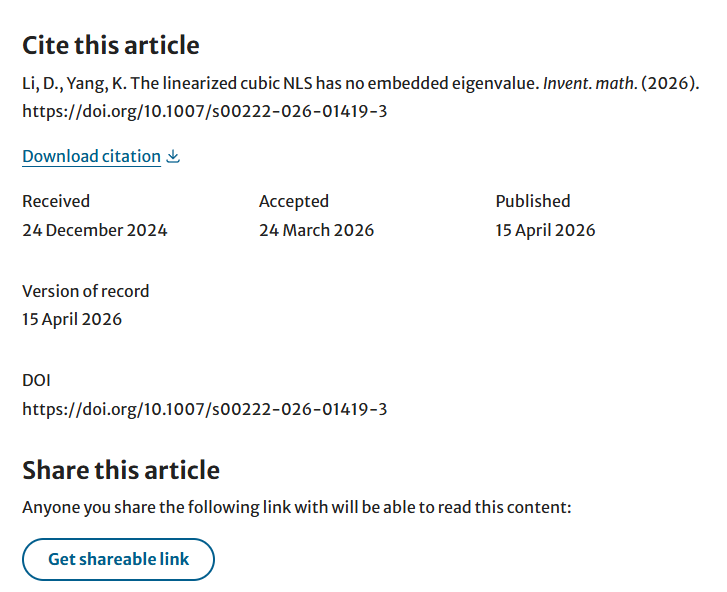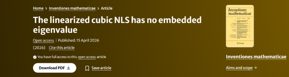 近日,西安交通大学2009届本科优秀毕业生、东南大学数学学院副教授杨凯在数学领域四大顶级期刊之一的《数学新进展》(Inventiones Mathematicae)在线发表了重要合作研究成果——“The linearized cubic NLS has no embedded eigenvalue”。该论文的另一位作者为香港大学数学系讲座教授李栋。这是西安交大校友在基础数学研究领域取得的又一重大突破。此前,学院陈红斌教授与校友姚若飞(2018届博士毕业生)及合作者的论文于今年1月13日在 Inventiones Mathematicae 在线发表。