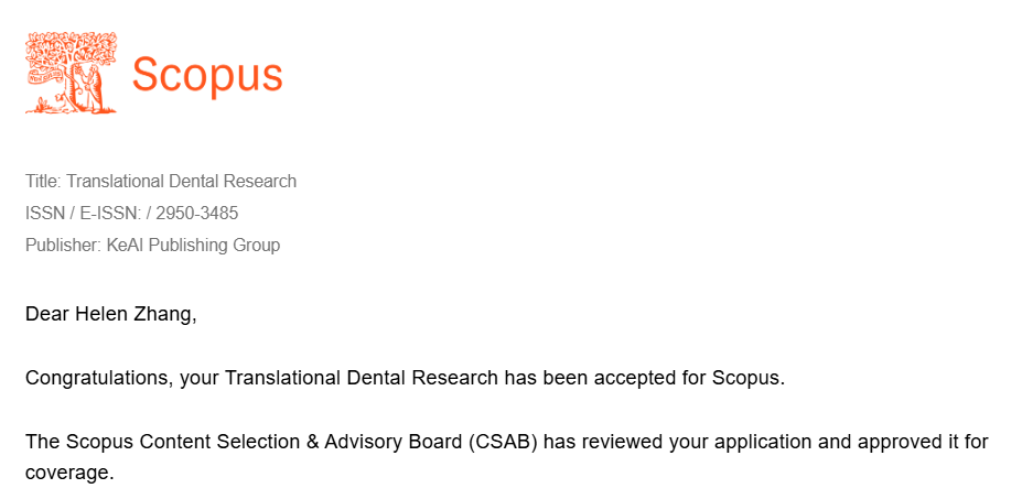 近日,经过爱思唯尔(Elsevier)旗下国际知名数据库Scopus内容遴选与咨询委员会(CSAB)评审,西安交大主办期刊《口腔转化医学(英文)》(Translational Dental Research,TDR)已正式被Scopus数据库收录。这标志着期刊的学术质量、出版规范及国际传播能力获得国际学术界认可,是期刊国际化发展进程中的重要突破。