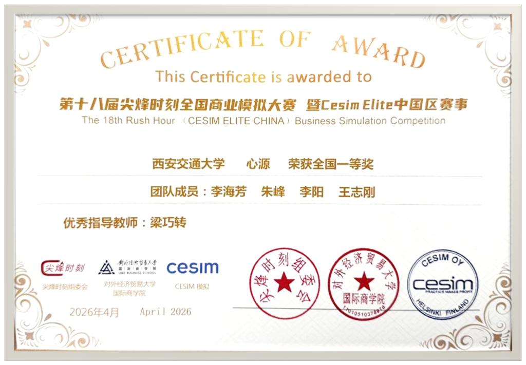 2026年4月26日,在刚刚落幕的第十八届“尖烽时刻”全国商业模拟大赛总决赛上,西安交通大学心源团队凭借精准的商业决策、出色的战略推演与高水平现场答辩,从全国170余所高校、近2000支参赛队伍中突围,一举斩获MBA/研究生组全国一等奖,获得西安交大在该项赛事中的历史最佳战绩。这一成绩不仅续写了MBA学子在全国高水平商科赛事中的亮眼表现,更充分展现了学院深化实践教学改革、强化复合型管理人才培养的显著成效。