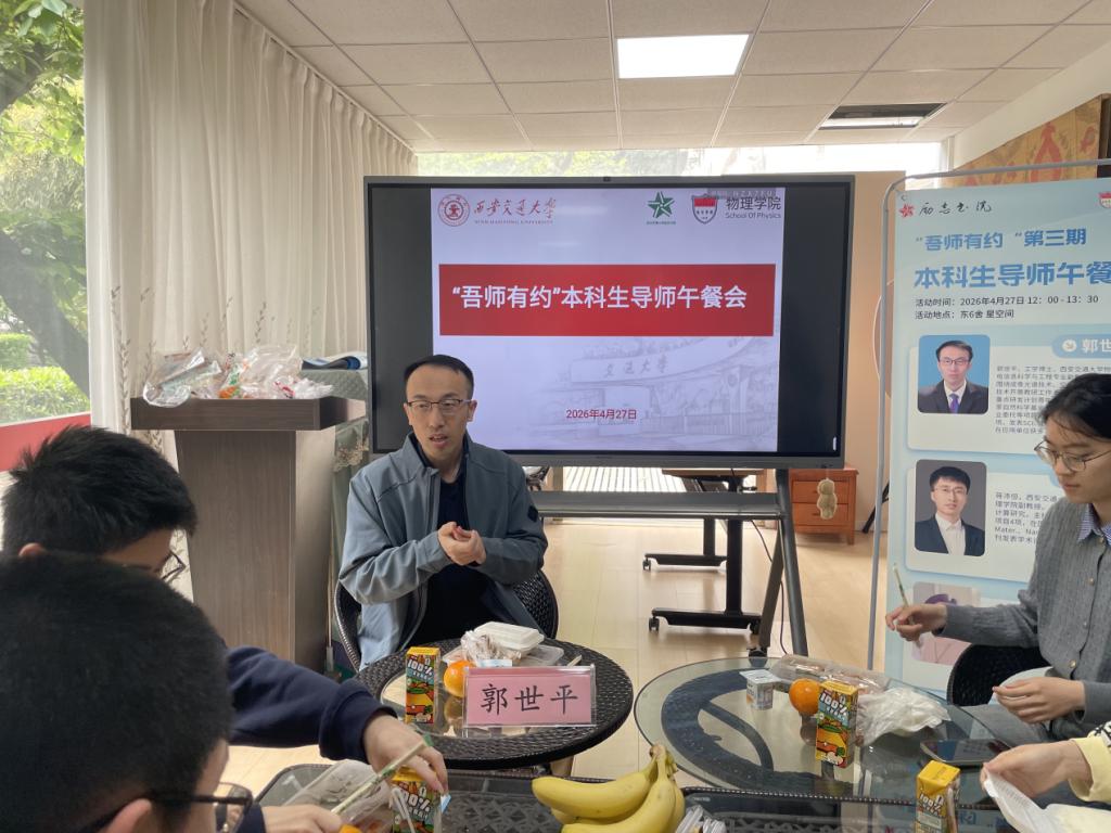 为深化本科生培养模式改革,搭建师生常态化、近距离交流平台,促进学生学业发展与生涯规划,4月27日中午,励志书院与物理学院携手举办“吾师有约”本科生导师午餐会。活动特邀物理学院郭世平副教授、蒋沛恒副教授、潘璇副教授作为学业导师嘉宾,励志书院辅导员田亮、段雪琴共同参与,与物理相关专业学生围绕学业、科研、未来成长等话题,开展了一场轻松而深入的交流。